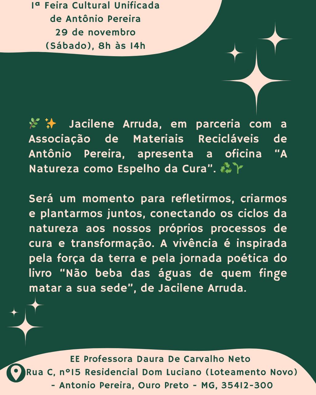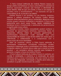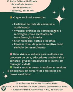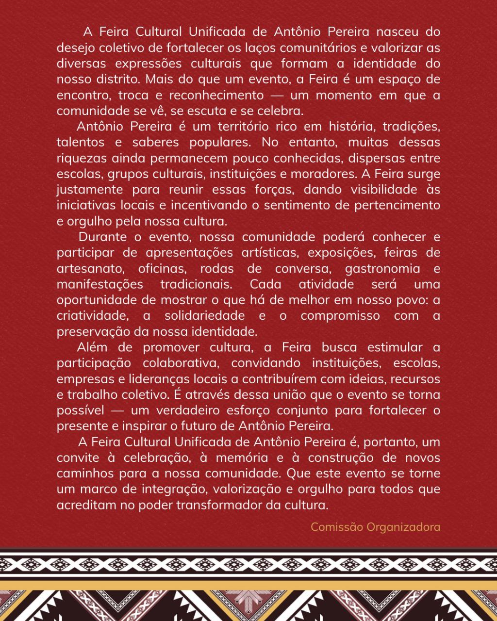 O mês de novembro encerrou-se com um marco especial: a realização da Primeira Feira Cultural Unificada de Antônio Pereira, fruto de uma construção coletiva e participativa.