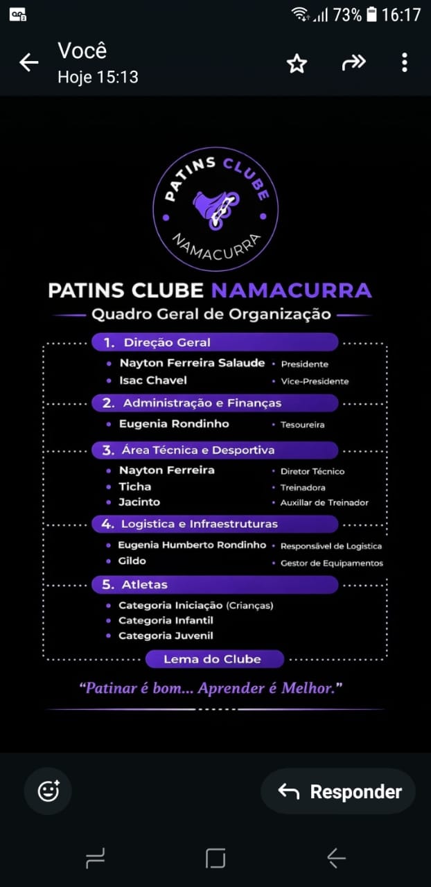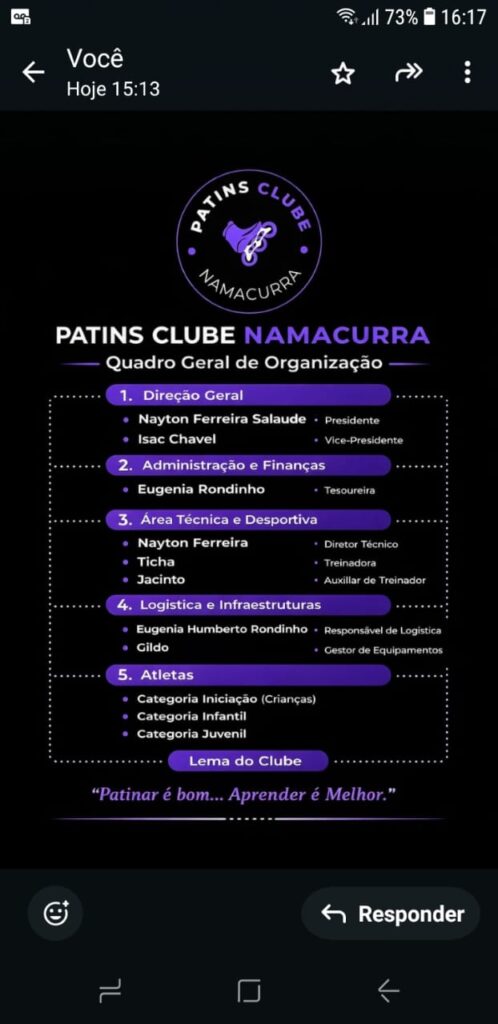 “Não é apenas um projeto, é uma escola de ensino na verdade, onde a pessoa aprende não só a prática, como também à teoria, são conhecimentos tão importantes que são passados no patins clube, não ensinam só a praticar, como a lidar com o mundo lá fora, educando e disciplinando!”